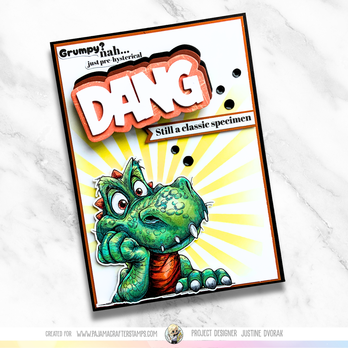 Bring prehistoric humor to your paper crafting with this 4x6 photopolymer stamp set featuring a slightly annoyed T-Rex and five hilarious pre-historical sentiments. Perfect for creating funny cards, scrapbook layouts, and mixed media projects.