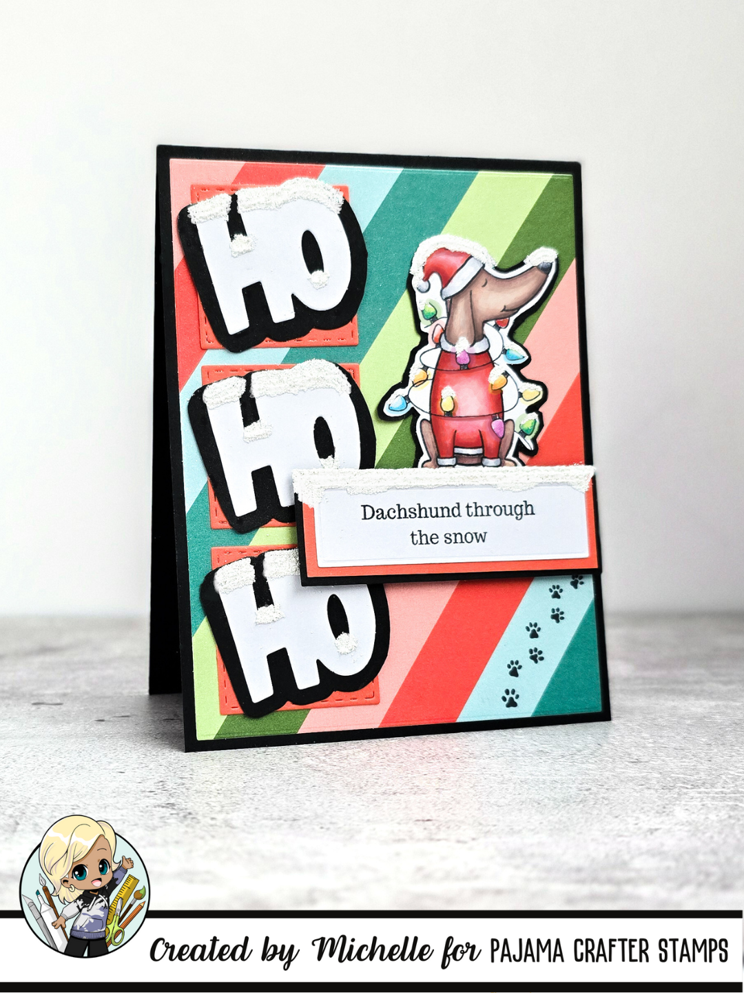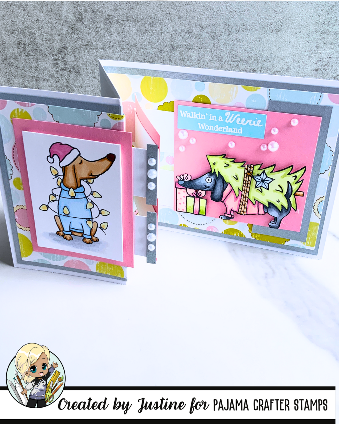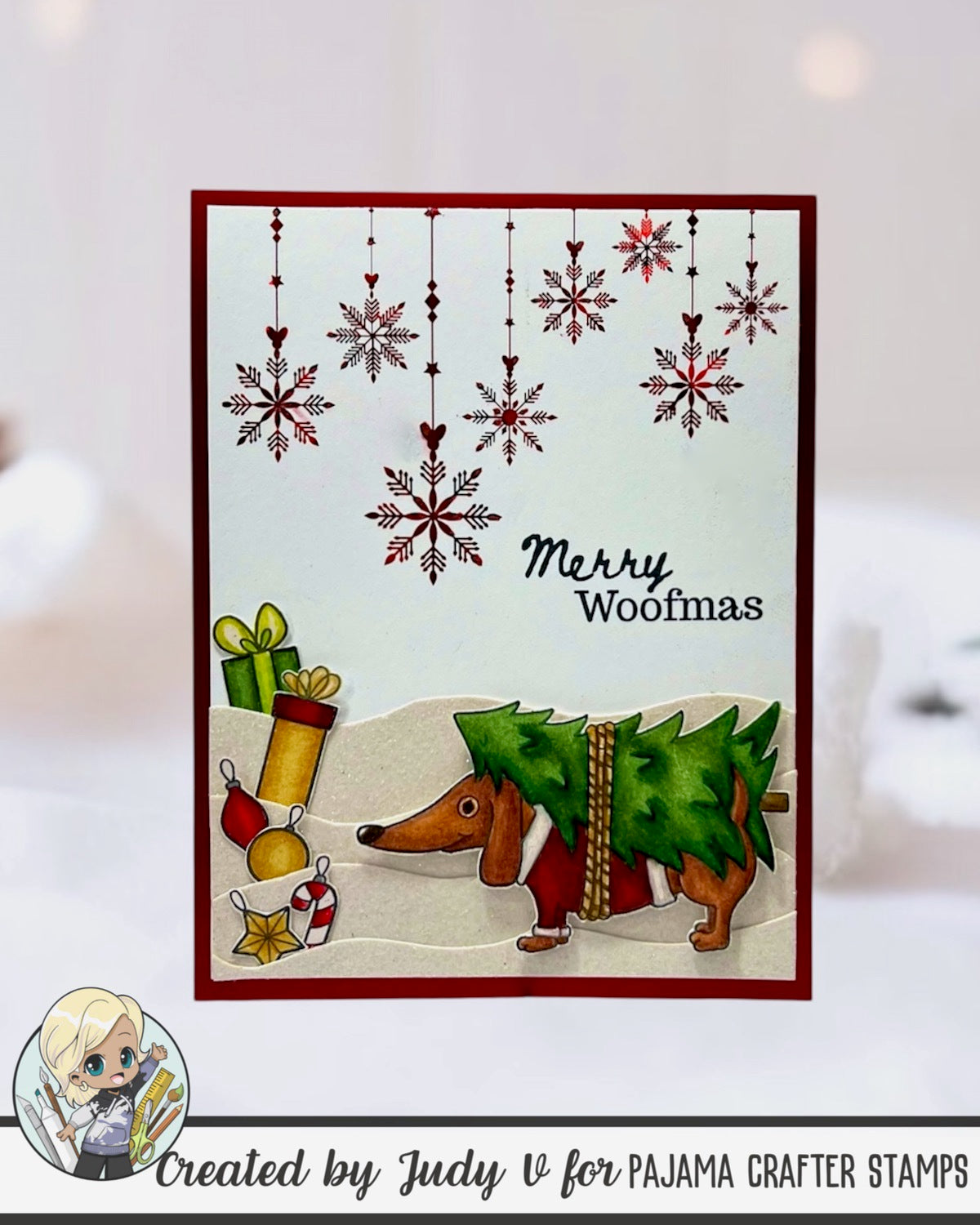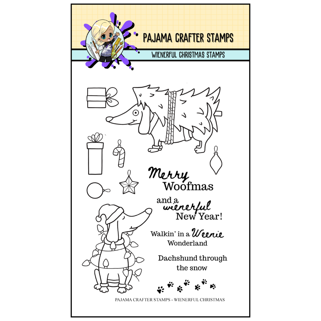 Celebrate the holidays with a playful touch using these 4x6 photopolymer stamps featuring adorable wiener dogs tangled in Christmas lights and carrying a festive tree. Perfect for adding charm to your holiday cards and crafts, these stamps bring a fun, whimsical spirit to your seasonal projects.